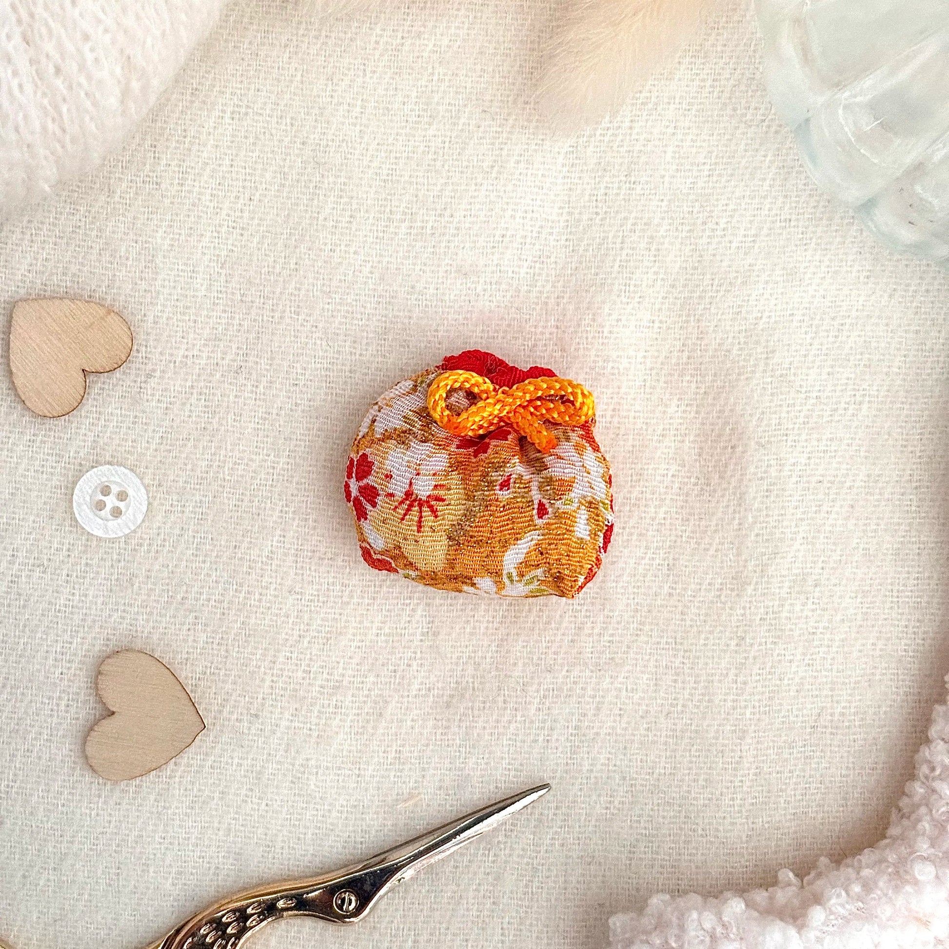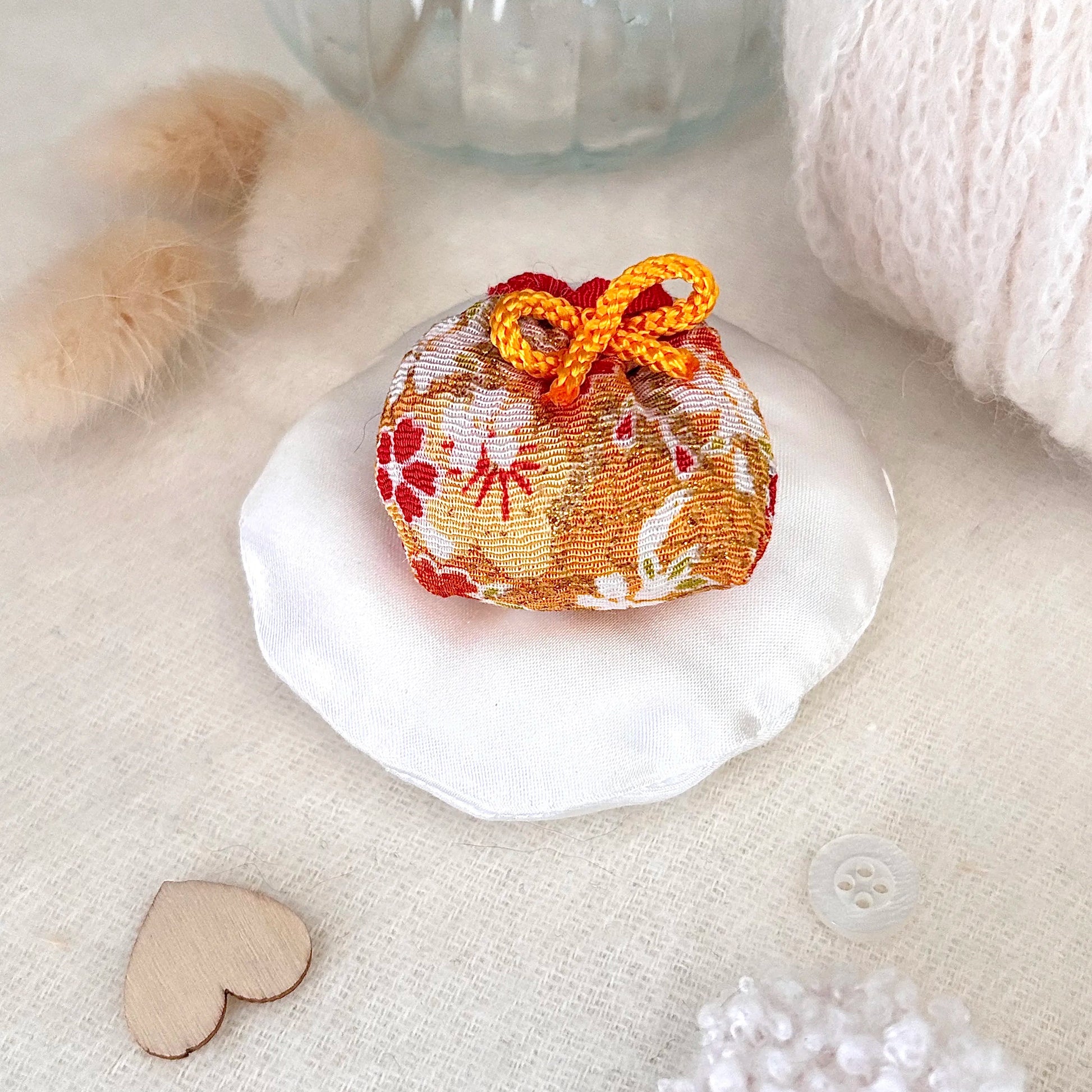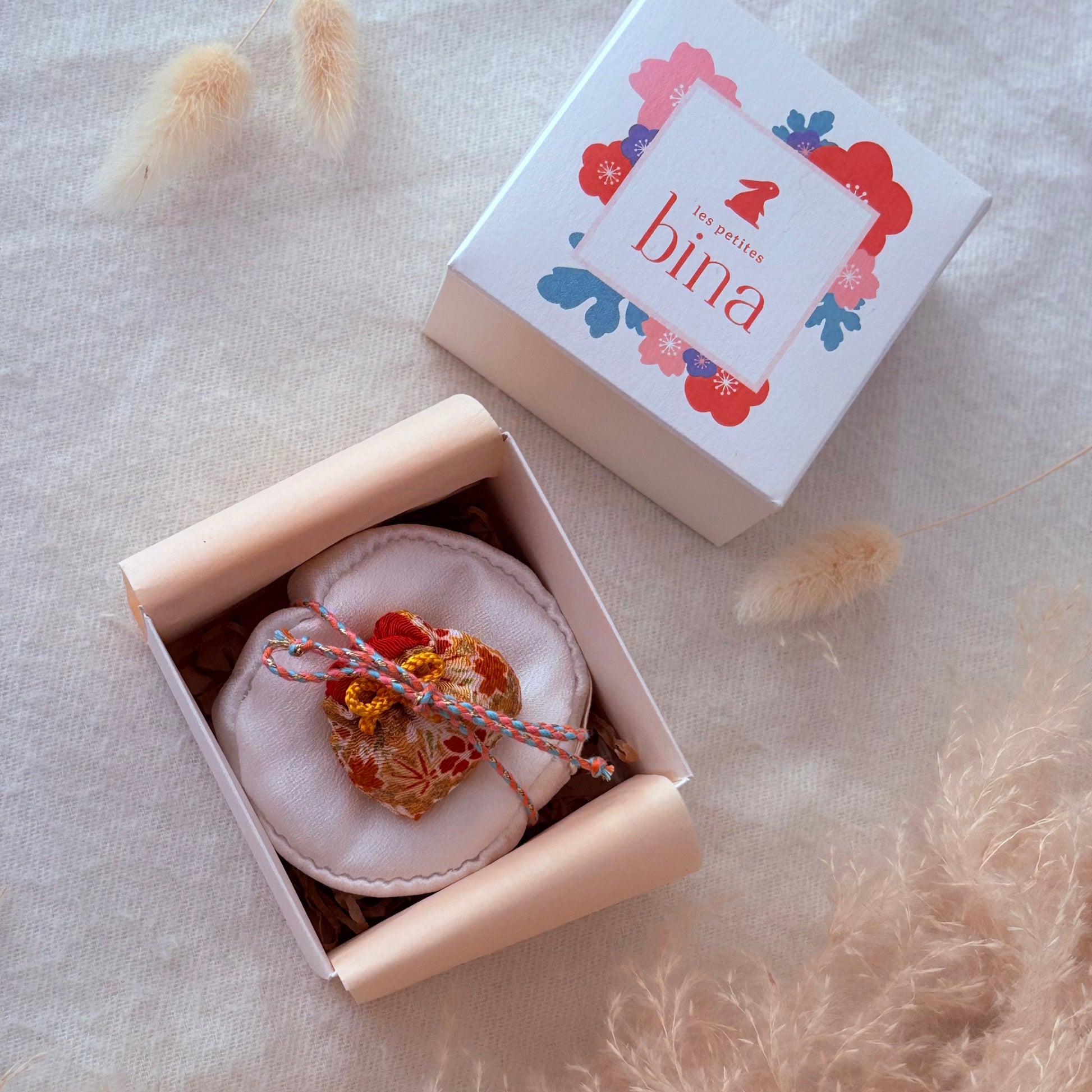 - Matières : la bina est en chirimen (tissu crêpe rayonne en provenance du Japon) et polyester, le coussin est en tissu crêpe envers satin et polyester